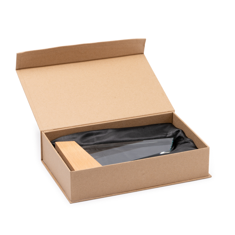 Trofeo de cristal de diseño rectangular con base de bambú. Incluye estuche de presentación diseño kraft.